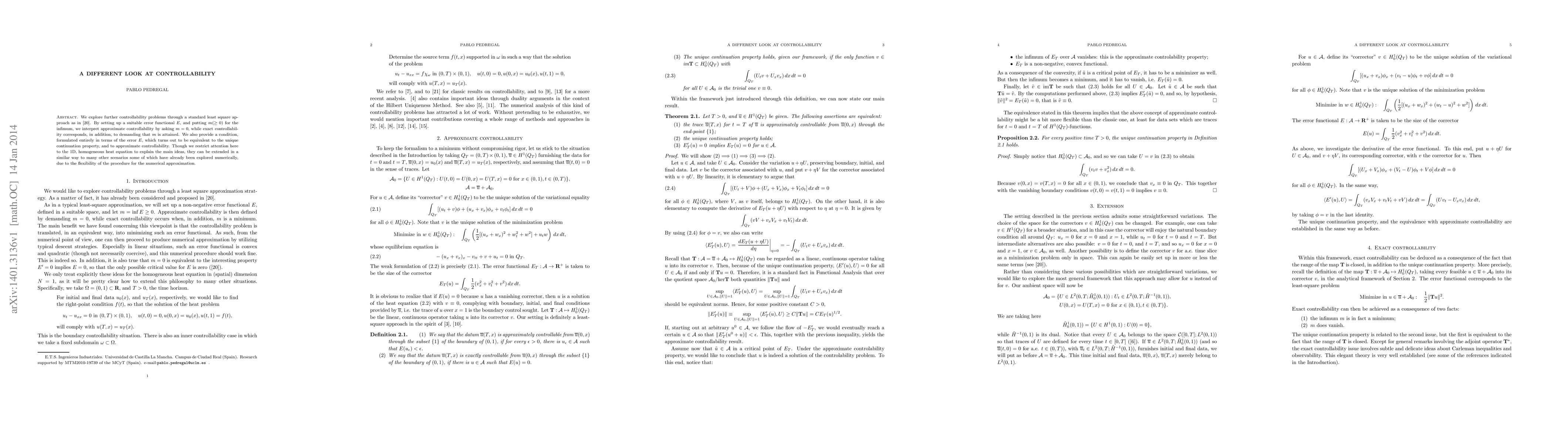 We explore further controllability problems through a standard least square approach. By setting up a suitable error functional $E$, and putting $m(\ge0)$ for the infimum, we interpret approximate controllability by asking $m=0$, while exact controllability corresponds, in addition, to demanding that $m$ is attained. We also provide a condition, formulated entirely in terms of the error $E$, which turns out to be equivalent to the unique continuation property, and to approximate controllability. Though we restrict attention here to the 1D, homogeneous heat equation to explain the main ideas, they can be extended in a similar way to many other scenarios some of which have already been explored numerically, due to the flexibility of the procedure for the numerical approximation.