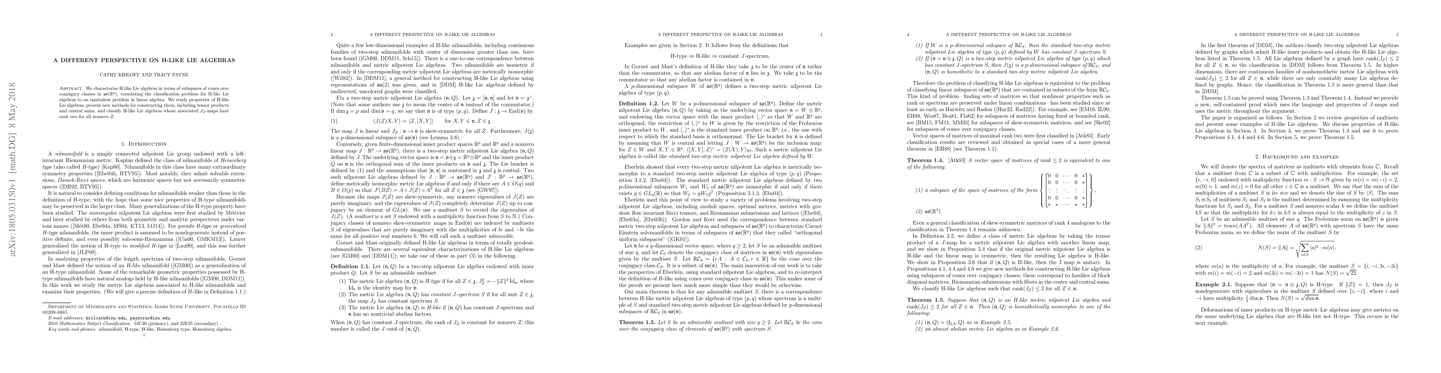 We characterize H-like Lie algebras in terms of subspaces of cones over conjugacy classes in $\mathfrak{so}(\mathbb{R}^q)$, translating the classification problem for H-like Lie algebras to an equivalent problem in linear algebra. We study properties of H-like Lie algebras, present new methods for constructing them, including tensor products and central sums, and classify H-like Lie algebras whose associated $J_Z$-maps have rank two for all nonzero $Z$.