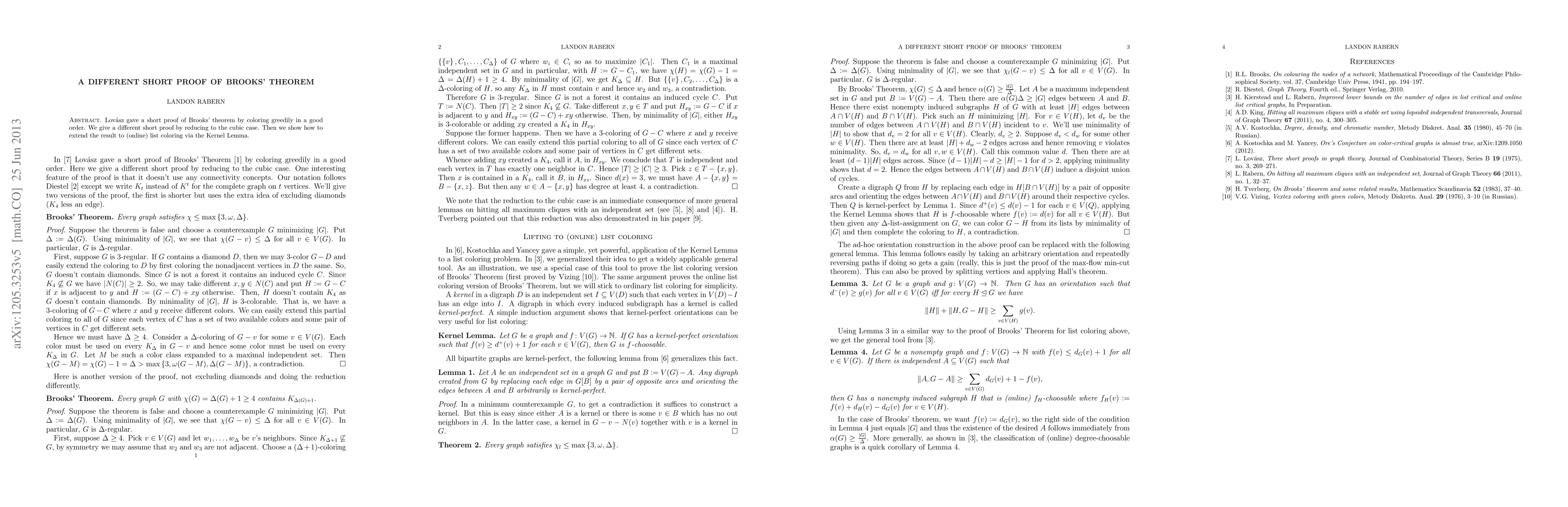 This research provides a different short proof of Brooks' theorem and extends the result to online list coloring via the Kernel Lemma
