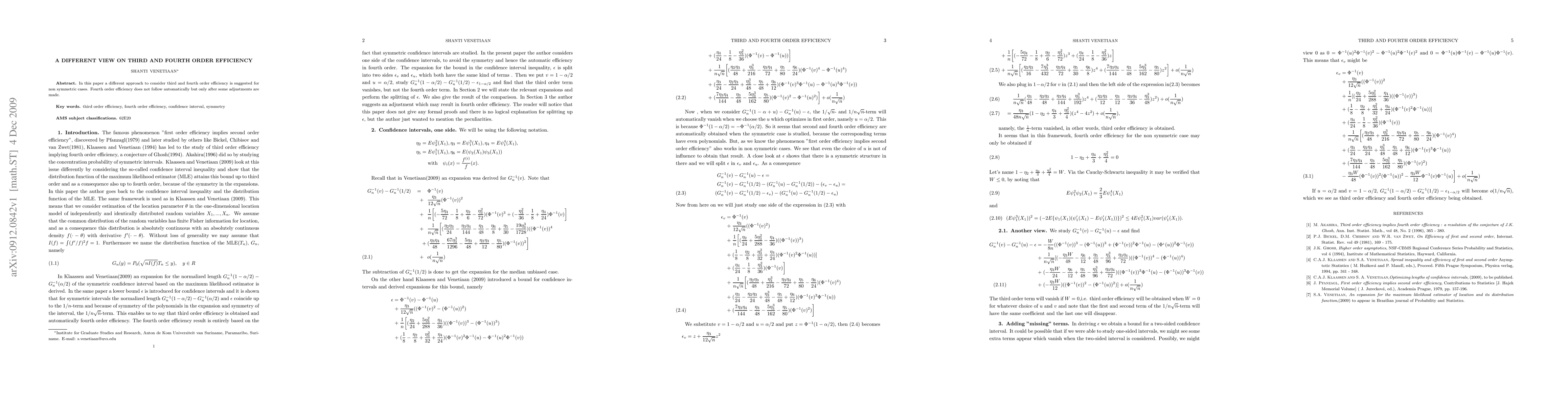 This paper proposes a novel approach to evaluate third and fourth order efficiency in non-symmetric cases, emphasizing that fourth order efficiency requires specific adjustments beyond standard methods.