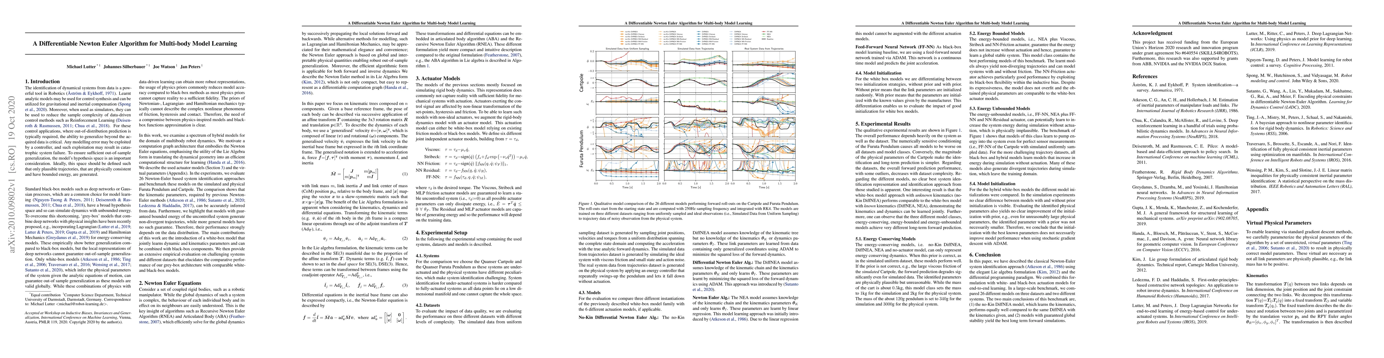 This paper introduces a differentiable Newton Euler algorithm for learning multi-body robot dynamics, combining white-box and black-box modeling to accurately infer kinematic parameters from data. The proposed grey-box model demonstrates stable, non-divergent trajectories and outperforms comparable models in system identification tasks for simulated and physical pendulum systems.