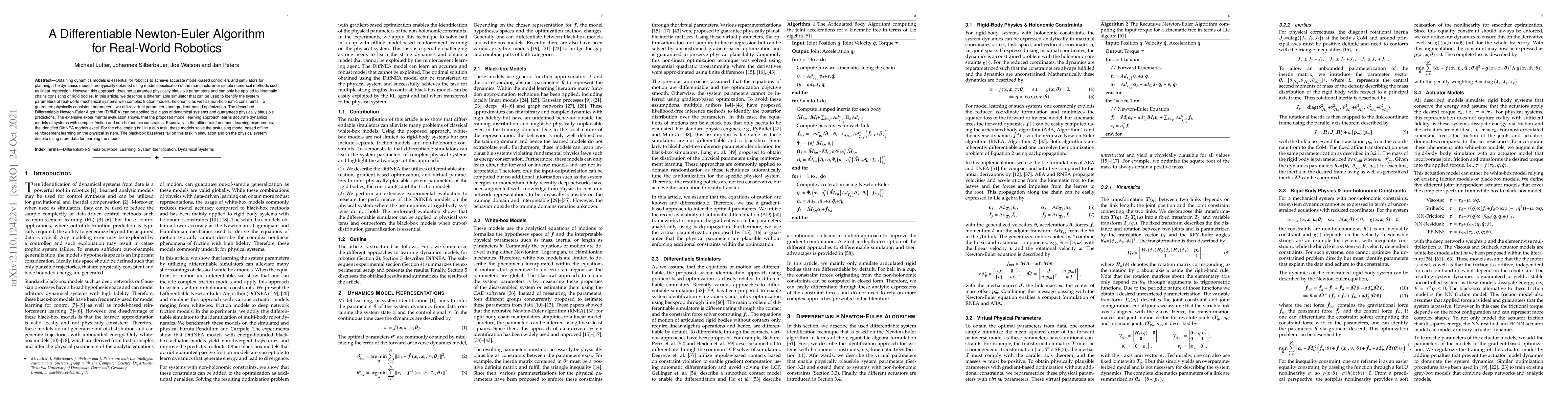 This paper presents a Differentiable Newton-Euler Algorithm (DiffNEA) for identifying physically plausible dynamics models of real-world mechanical systems, including complex friction and constraints. The method uses gradient-based optimization with virtual parameters, demonstrating superior performance in offline reinforcement learning tasks, such as the ball in a cup challenge.