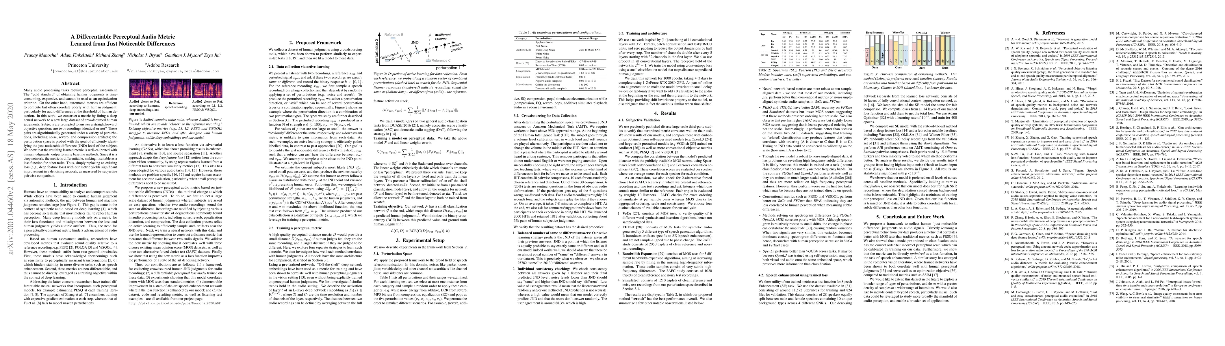 This paper develops a differentiable perceptual audio metric by training a deep neural network on crowdsourced human judgments of audio similarity. The metric outperforms baselines and is shown to be effective in improving audio denoising tasks when used as a loss function.
