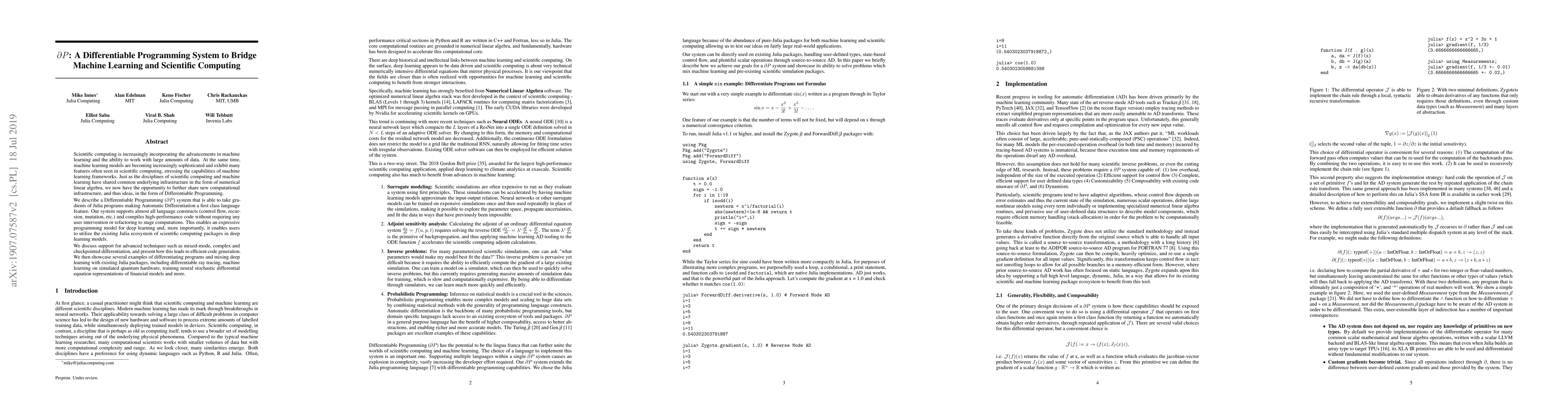 This paper introduces Zygote, a Differentiable Programming system in Julia that bridges machine learning and scientific computing by enabling automatic differentiation of general program structures. It supports advanced techniques like mixed-mode, complex, and checkpointed differentiation, allowing seamless integration of machine learning models with scientific computing libraries.