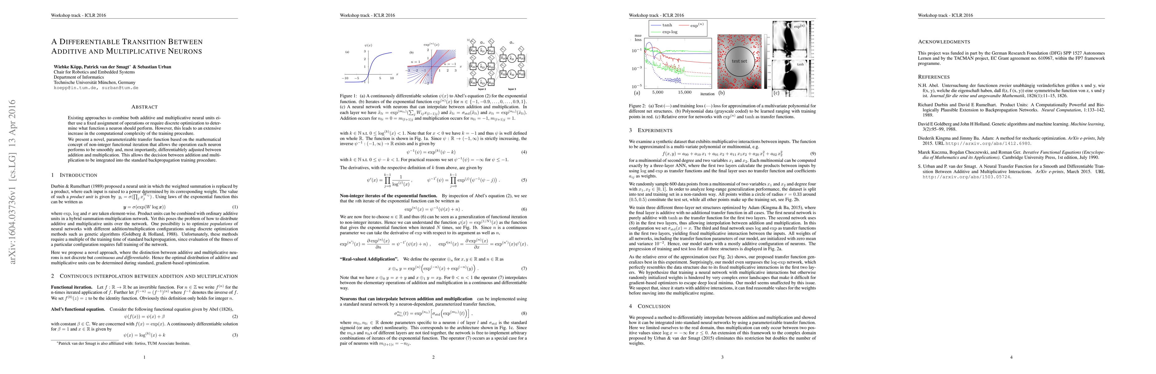 This paper introduces a new parameterizable transfer function that enables smooth and differentiable transitions between additive and multiplicative operations in neural units, reducing computational complexity during training by integrating this decision into standard backpropagation.