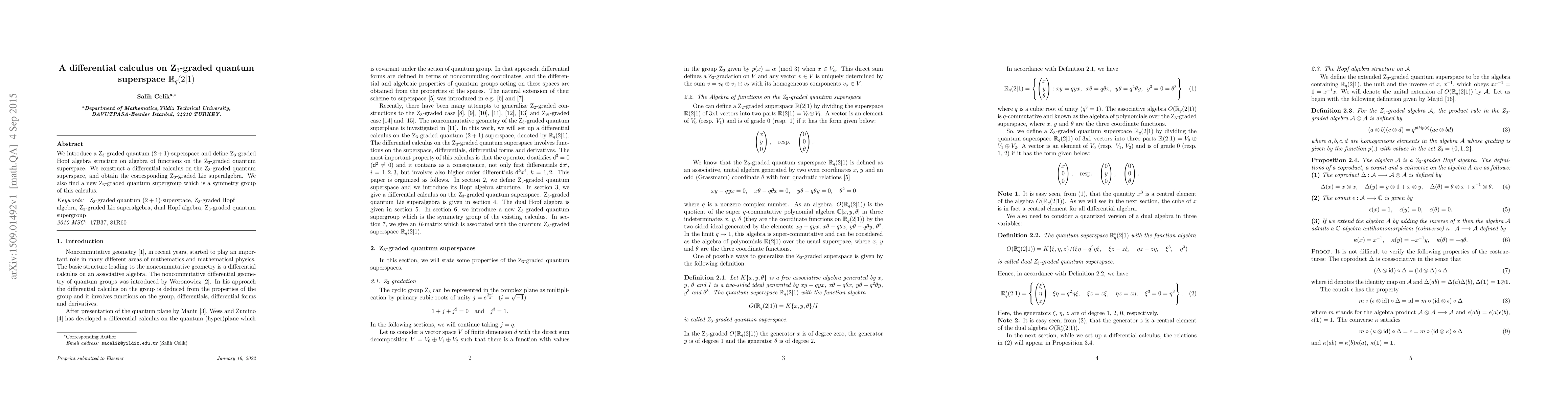This paper introduces a Z$_3$-graded quantum superspace ${\mathbb R}_q(2|1)$ and constructs a differential calculus on it, defining a Z$_3$-graded Hopf algebra structure. It also identifies a new Z$_3$-graded quantum supergroup acting as the symmetry group for this calculus.