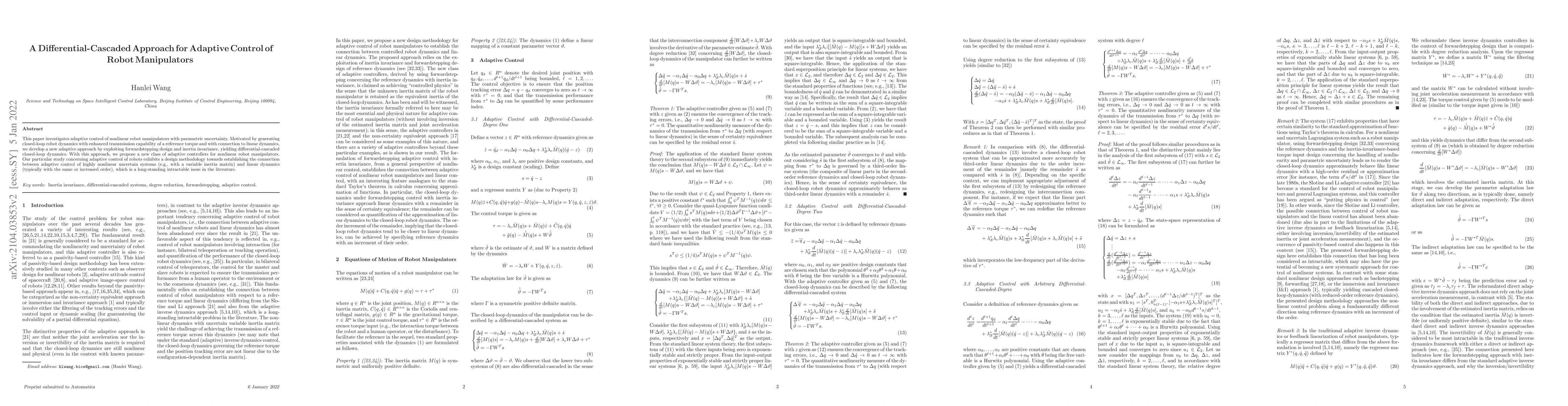 This paper investigates adaptive control of nonlinear robot manipulators with parametric uncertainty. Motivated by generating closed-loop robot dynamics with enhanced transmission capability of a reference torque and with connection to linear dynamics, we develop a new adaptive approach by exploiting forwardstepping design and inertia invariance, yielding differential-cascaded closed-loop dynamics. With this approach, we propose a new class of adaptive controllers for nonlinear robot manipulators. Our particular study concerning adaptive control of robots exhibits a design methodology towards establishing the connection between adaptive control of highly nonlinear uncertain systems (e.g., with a variable inertia matrix) and linear dynamics (typically with the same or increased order), which is a long-standing intractable issue in the literature.