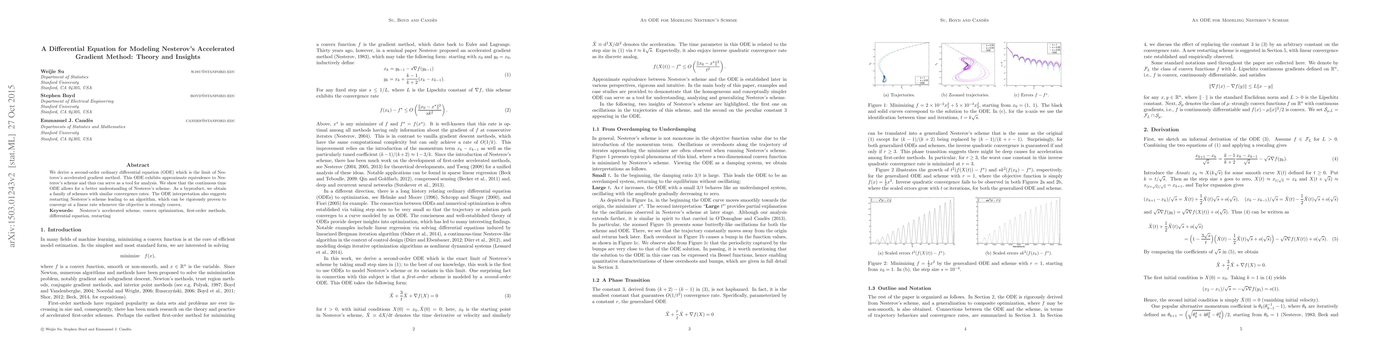 This paper derives a second-order ODE that approximates Nesterov's accelerated gradient method, providing deeper insights into its behavior and convergence properties. The ODE interpretation also leads to a new restarting algorithm with linear convergence for strongly convex objectives.