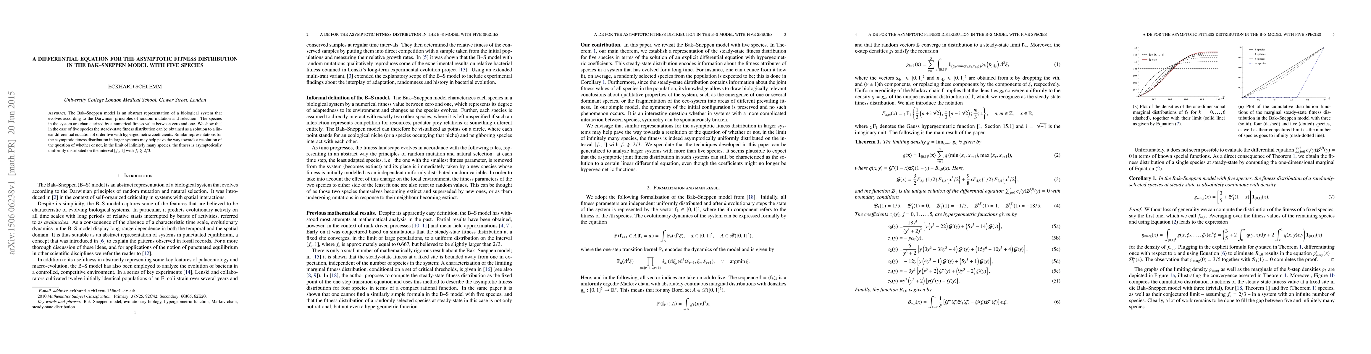This paper explores the Bak-Sneppen model, demonstrating that the asymptotic fitness distribution for a system with five species follows a linear differential equation of order five. It suggests that similar equations for larger systems may aid in determining if fitness distribution converges to a uniform distribution in the limit of infinitely many species.