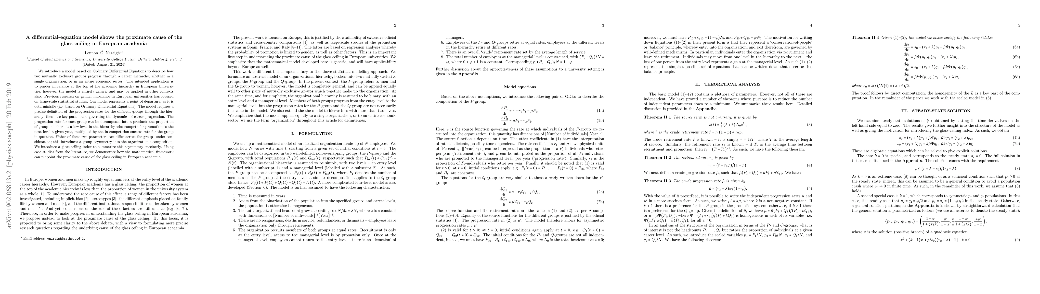 This paper introduces a deterministic differential-equation model to explain gender imbalance in European academic hierarchies, focusing on the "glass ceiling" effect. The model identifies key parameters like progression rates and success rates, which can differ between groups, leading to an asymmetry that the authors quantify with a glass-ceiling index.