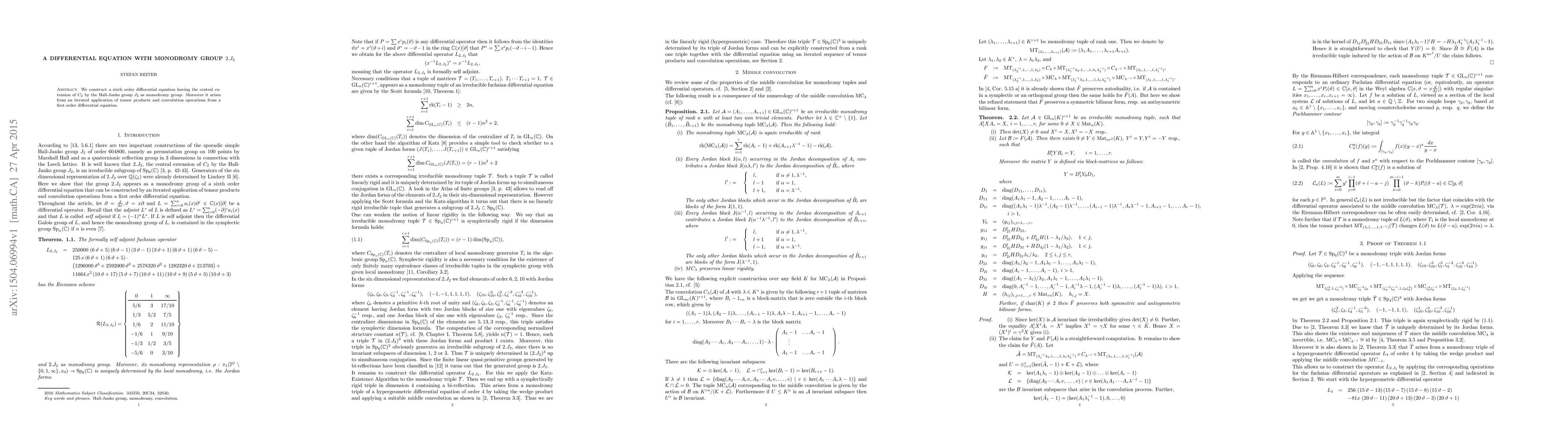 Researchers constructed a sixth-order differential equation with a specific monodromy group structure, which arises from applying mathematical operations to a first-order equation.