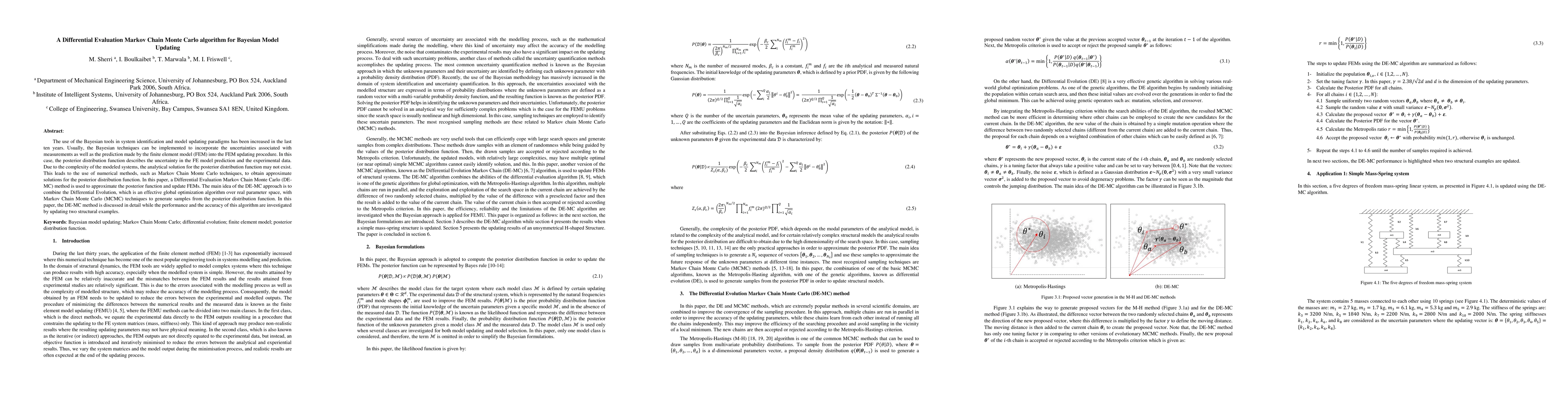 This paper proposes a Differential Evaluation Markov Chain Monte Carlo (DE-MC) algorithm for Bayesian Model Updating, combining Differential Evolution for global optimization with MCMC to approximate the posterior distribution function in finite element models. The method's effectiveness is demonstrated through the updating of two structural examples.