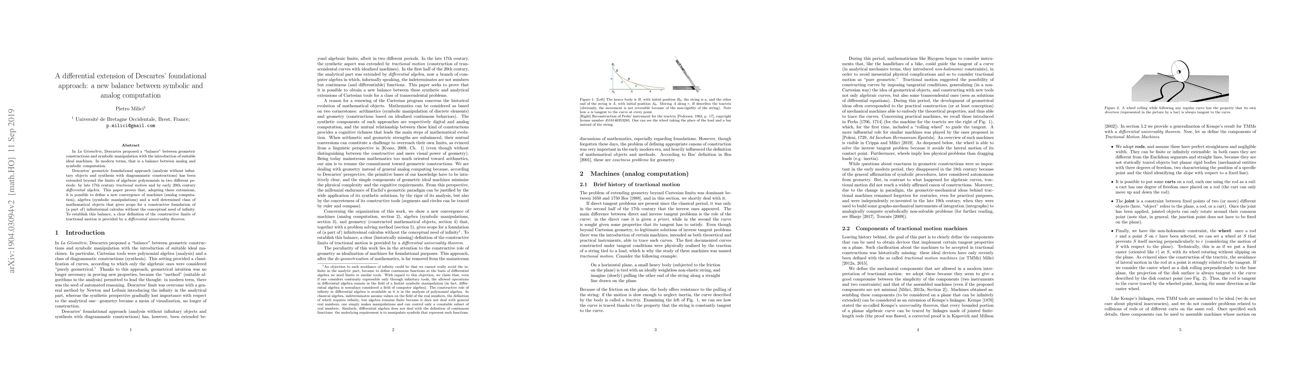 In La G\'eom\'etrie, Descartes proposed a balance between geometric constructions and symbolic manipulation with the introduction of suitable ideal machines. In modern terms, that is a balance between analog and symbolic computation. Descartes' geometric foundational approach (analysis without infinitary objects and synthesis with diagrammatic constructions) has been extended beyond the limits of algebraic polynomials in two different periods: by late 17th century tractional motion and by early 20th century differential algebra. This paper proves that, adopting these extensions, it is possible to define a new convergence of machines (analog computation), algebra (symbolic manipulations) and a well determined class of mathematical objects that gives scope for a constructive foundation of (a part of) infinitesimal calculus without the conceptual need of infinity. To establish this balance, a clear definition of the constructive limits of tractional motion is provided by a differential universality theorem.