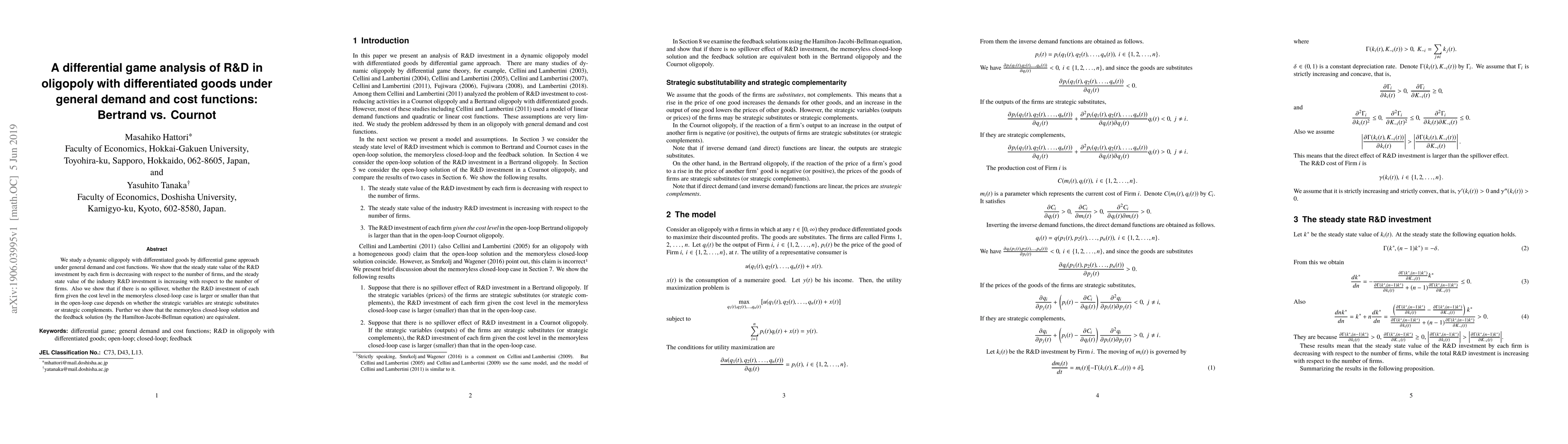 This paper analyzes R&D investment in an oligopoly market with differentiated goods using a differential game approach. It finds that the steady-state value of R&D investment decreases with the number of firms but increases with the industry's overall R&D investment.