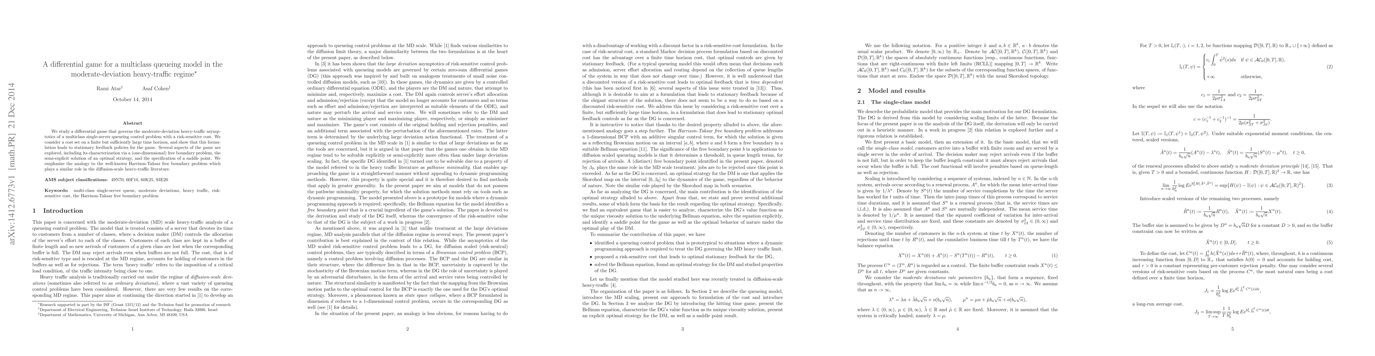 This paper explores a differential game governing a multiclass queueing model under moderate-deviation heavy-traffic conditions, focusing on risk-sensitive costs. The study reveals stationary feedback policies and characterizes the game via a free boundary problem, drawing parallels to the Harrison-Taksar problem in heavy-traffic diffusion-scale literature.