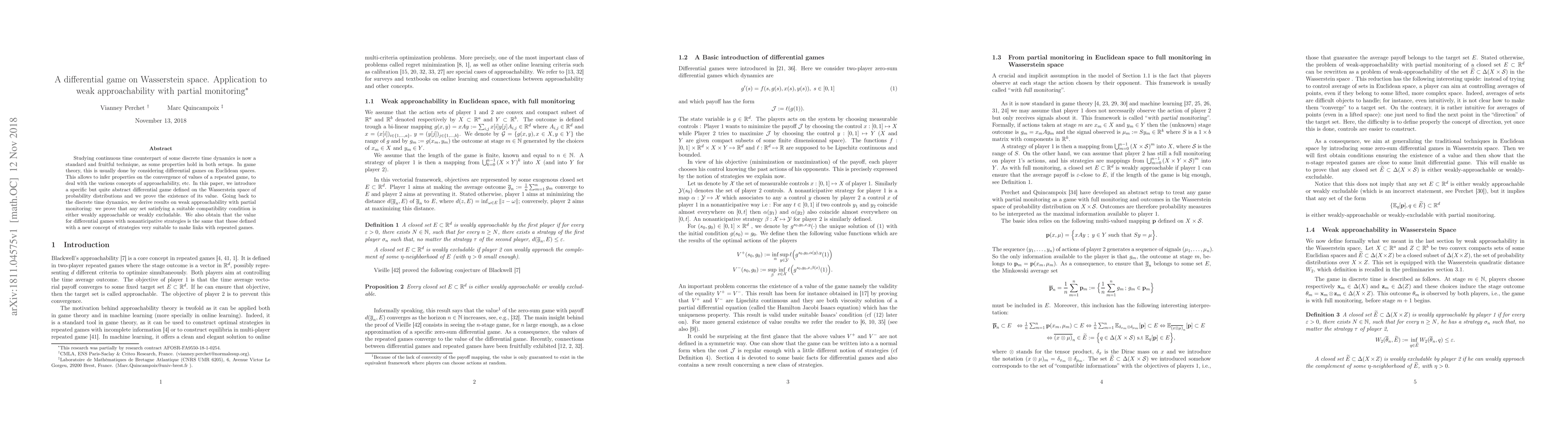 This paper introduces a differential game on the Wasserstein space of probability distributions, proving its value existence. It links the continuous game to discrete time dynamics, establishing results on weak approachability with partial monitoring, showing that compatible sets are either weakly approachable or excludable.