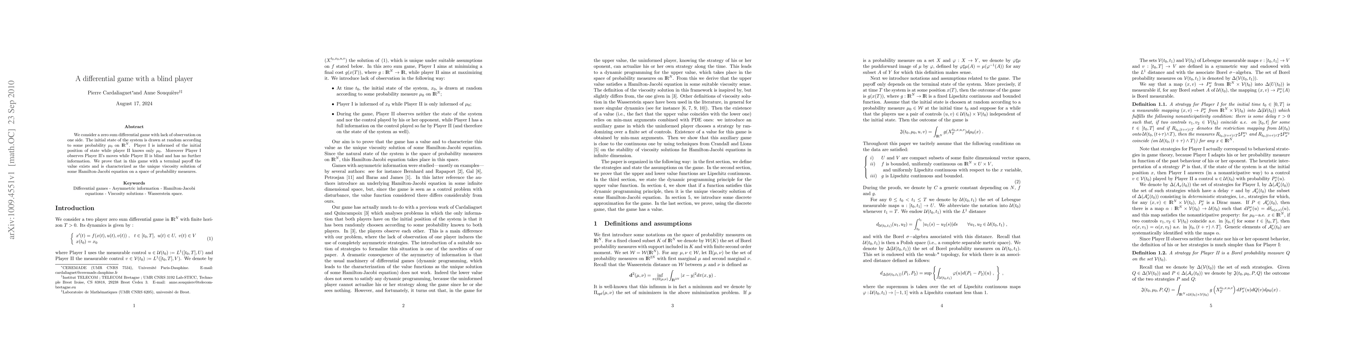 This paper studies a zero-sum differential game where Player-I has full information but Player-II is blind, only knowing the initial state distribution. The game's value is shown to exist and is characterized by the unique viscosity solution of a Hamilton-Jacobi equation on a space of probability measures.