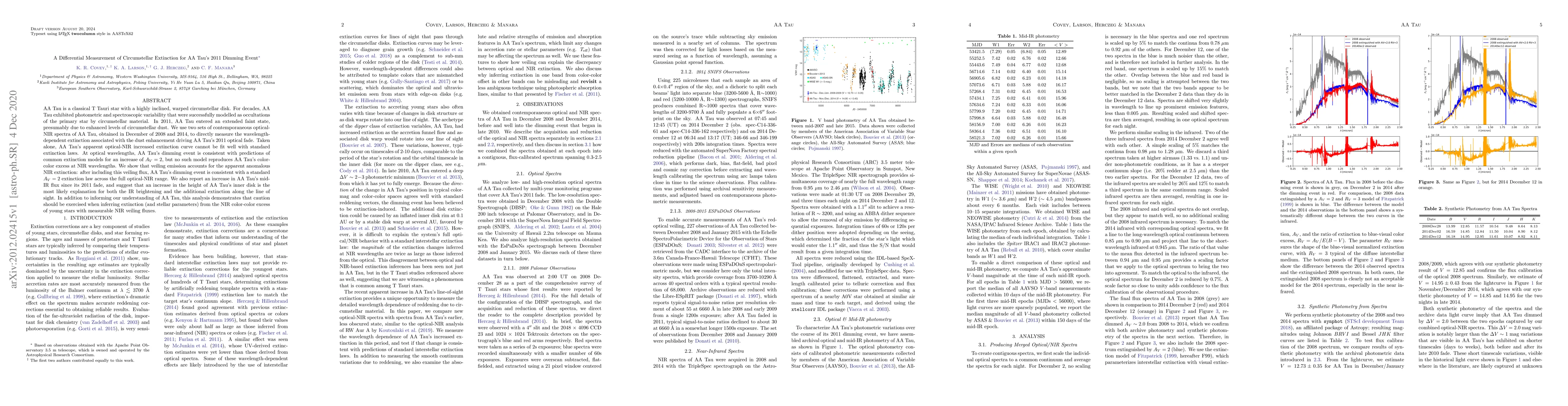 AA Tau is a classical T Tauri star with a highly inclined, warped circumstellar disk. For decades, AA Tau exhibited photometric and spectroscopic variability that were successfully modelled as occultations of the primary star by circumstellar material. In 2011, AA Tau entered an extended faint state, presumably due to enhanced levels of circumstellar dust. We use two sets of contemporaneous optical-NIR spectra of AA Tau, obtained in December of 2008 and 2014, to directly measure the wavelength-dependent extinction associated with the dust enhancement driving AA Tau's 2011 optical fade. Taken alone, AA Tau's apparent optical-NIR increased extinction curve cannot be fit well with standard extinction laws. At optical wavelengths, AA Tau's dimming event is consistent with predictions of common extinction models for an increase of $A_V=2$, but no such model reproduces AA Tau's color-color excess at NIR wavelengths. We show that veiling emission accounts for the apparent anomalous NIR extinction: after including this veiling flux, AA Tau's dimming event is consistent with a standard $A_V=2$ extinction law across the full optical-NIR range. We also report an increase in AA Tau's mid-IR flux since its 2011 fade, and suggest that an increase in the height of AA Tau's inner disk is the most likely explanation for both the IR brightening and the additional extinction along the line of sight. In addition to informing our understanding of AA Tau, this analysis demonstrates that caution should be exercised when inferring extinction (and stellar parameters) from the NIR color-color excess of young stars with measurable NIR veiling fluxes.