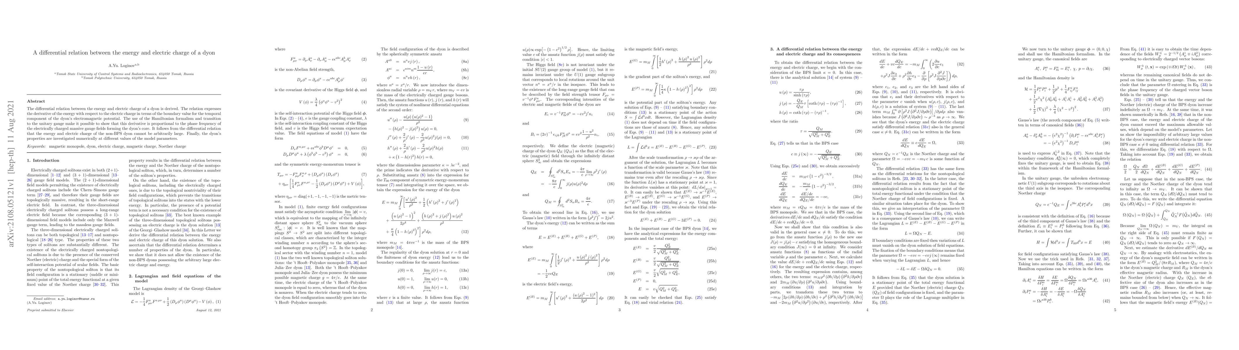 The differential relation between the energy and electric charge of a dyon is derived. The relation expresses the derivative of the energy with respect to the electric charge in terms of the boundary value for the temporal component of the dyon's electromagnetic potential. The use of the Hamiltonian formalism and transition to the unitary gauge make it possible to show that this derivative is proportional to the phase frequency of the electrically charged massive gauge fields forming the dyon's core. It follows from the differential relation that the energy and electric charge of the non-BPS dyon cannot be arbitrarily large. Finally, the dyon's properties are investigated numerically at different values of the model parameters.