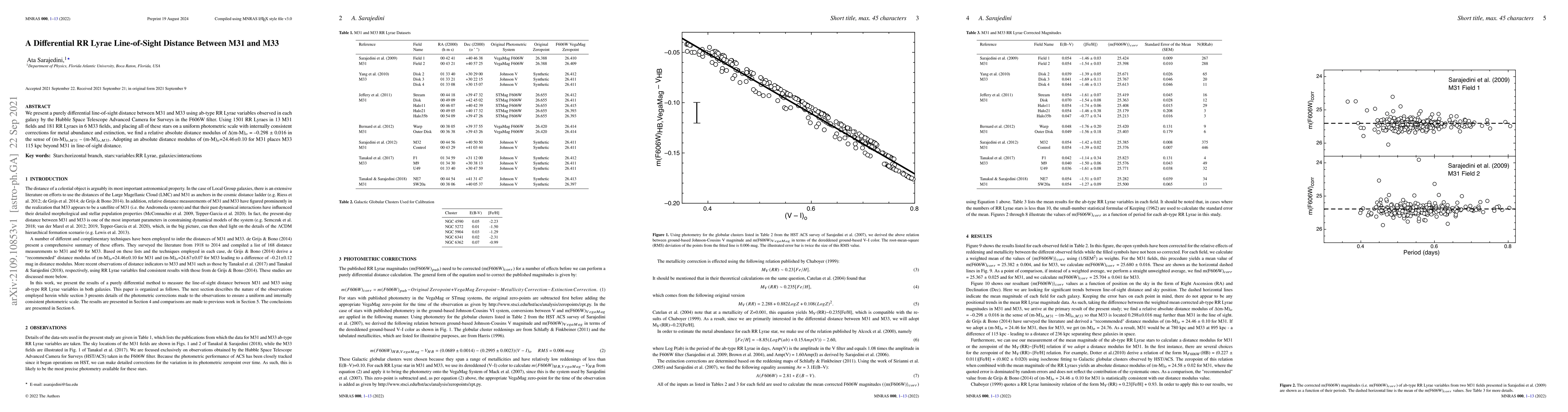 This paper presents a differential line-of-sight distance between M31 and M33 using RR Lyrae variables observed in both galaxies, finding M33 to be 115 kpc farther than M31. The study uses Hubble Space Telescope data to derive a relative distance modulus of -0.298 +/- 0.016.