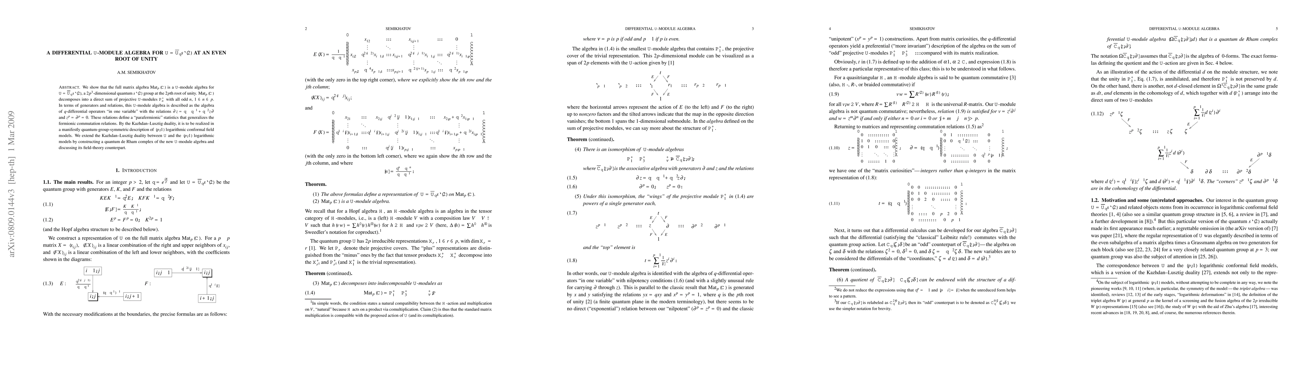 The paper demonstrates that Mat_p(C) serves as a U-module algebra for U_q sl(2) at the 2p-th root of unity, decomposing into a sum of projective U-modules. This algebra is described by q-differential operators with parafermionic statistics, extending Kazhdan-Lusztig duality for logarithmic conformal field models.