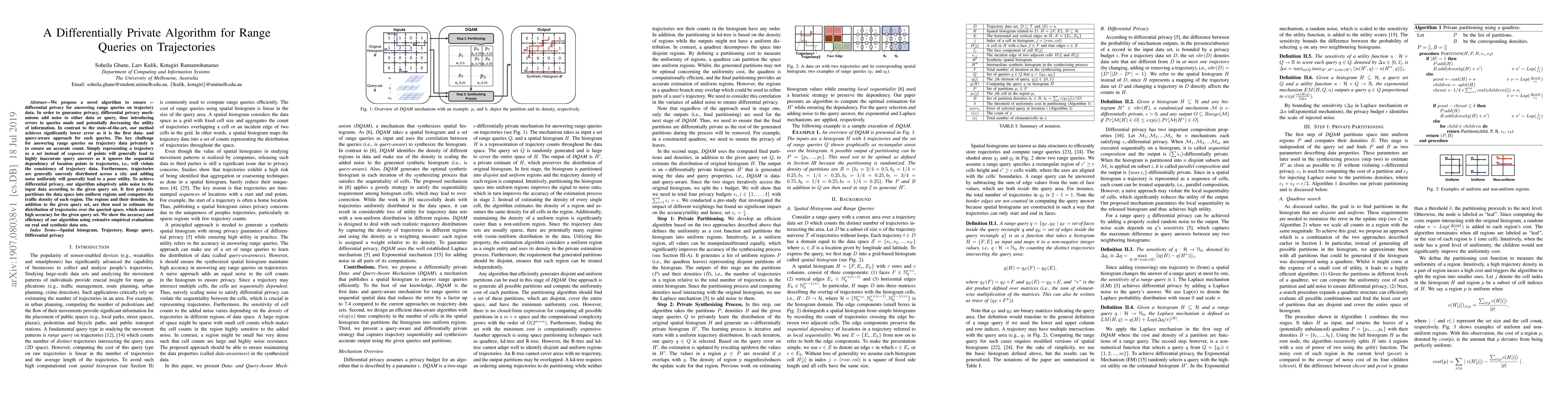 We propose a novel algorithm to ensure $\epsilon$-differential privacy for answering range queries on trajectory data. In order to guarantee privacy, differential privacy mechanisms add noise to either data or query, thus introducing errors to queries made and potentially decreasing the utility of information. In contrast to the state-of-the-art, our method achieves significantly lower error as it is the first data- and query-aware approach for such queries. The key challenge for answering range queries on trajectory data privately is to ensure an accurate count. Simply representing a trajectory as a set instead of \emph{sequence} of points will generally lead to highly inaccurate query answers as it ignores the sequential dependency of location points in trajectories, i.e., will violate the consistency of trajectory data. Furthermore, trajectories are generally unevenly distributed across a city and adding noise uniformly will generally lead to a poor utility. To achieve differential privacy, our algorithm adaptively adds noise to the input data according to the given query set. It first privately partitions the data space into uniform regions and computes the traffic density of each region. The regions and their densities, in addition to the given query set, are then used to estimate the distribution of trajectories over the queried space, which ensures high accuracy for the given query set. We show the accuracy and efficiency of our algorithm using extensive empirical evaluations on real and synthetic data sets.