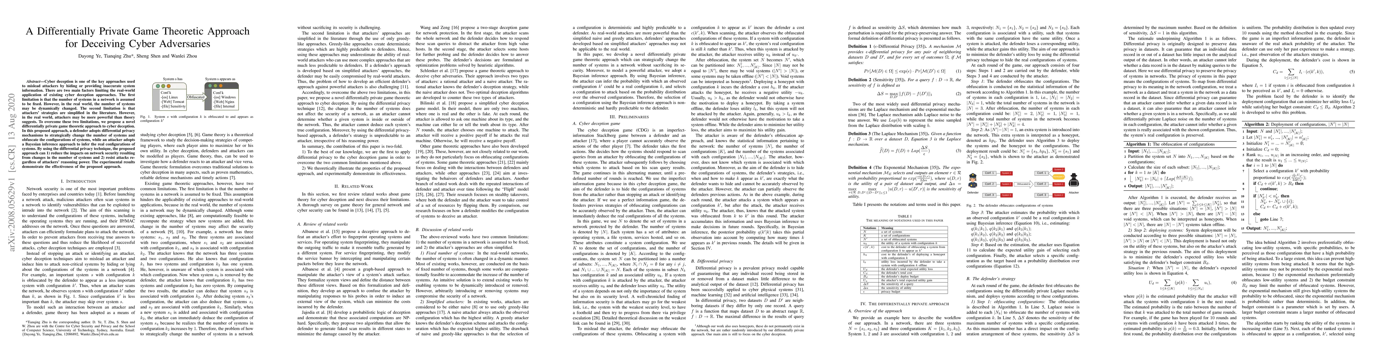This paper proposes a differentially private game theoretic approach to cyber deception that dynamically adjusts the number of systems and obfuscates configurations to mislead attackers. The method uses differential privacy to mitigate security impacts and resist attacks, regardless of the attacker's sophistication, demonstrating effectiveness through experiments.