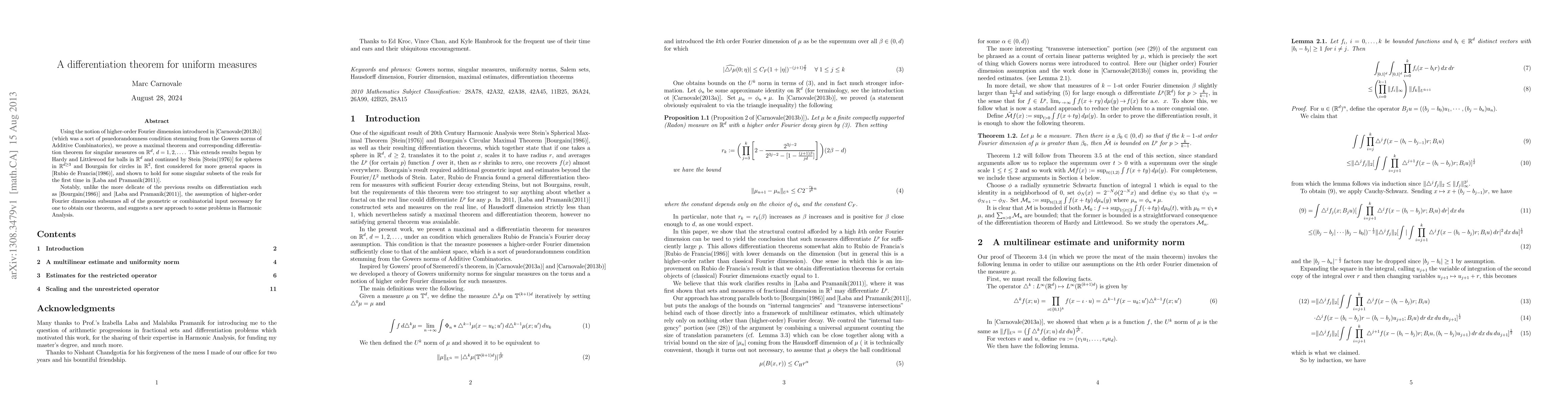 Using the notion of higher-order Fourier dimension introduced in \cite{M2} (which was a sort of psuedorandomness condition stemming from the Gowers norms of Additive Combinatorics), we prove a maximal theorem and corresponding differentiation theorem for singular measures on $\R^d$, $d=1,2,...$. This extends results begun by Hardy and Littlewood for balls in $\R^d$ and continued by Stein \cite{stein} for spheres in $\R^{d\geq 3}$ and Bourgain for circles in $\R^2$, first considered for more general spaces in \cite{rubio}, and shown to hold for some singular subsets of the reals for the first time in \cite{LabaDiff}. Notably, unlike the more delicate of the previous results on differentiation such as \cite{Bourgain} and \cite{LabaDiff}, the assumption of higher-order Fourier dimension subsumes all of the geometric or combinatorial input necessary for one to obtain our theorem, and suggests a new approach to some problems in Harmonic Analysis.