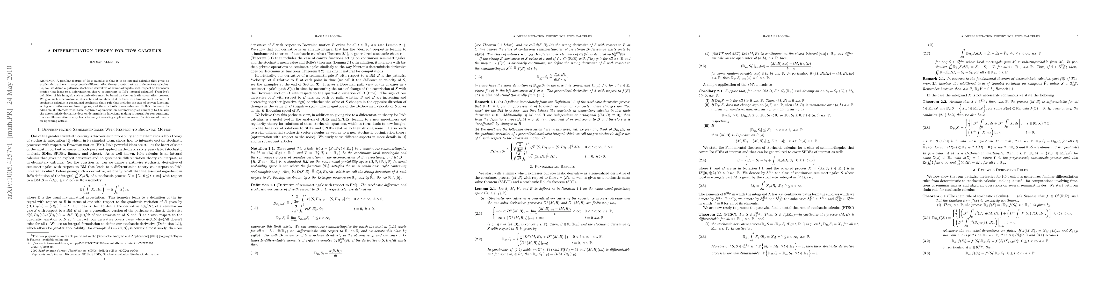 This paper introduces a pathwise stochastic derivative for semimartingales with respect to Brownian motion, based on the quadratic covariation process, establishing a differentiation theory parallel to Itô's integral calculus. It also presents a generalized stochastic chain rule, stochastic mean value, and Rolle's theorems, and discusses its applications in future work.
