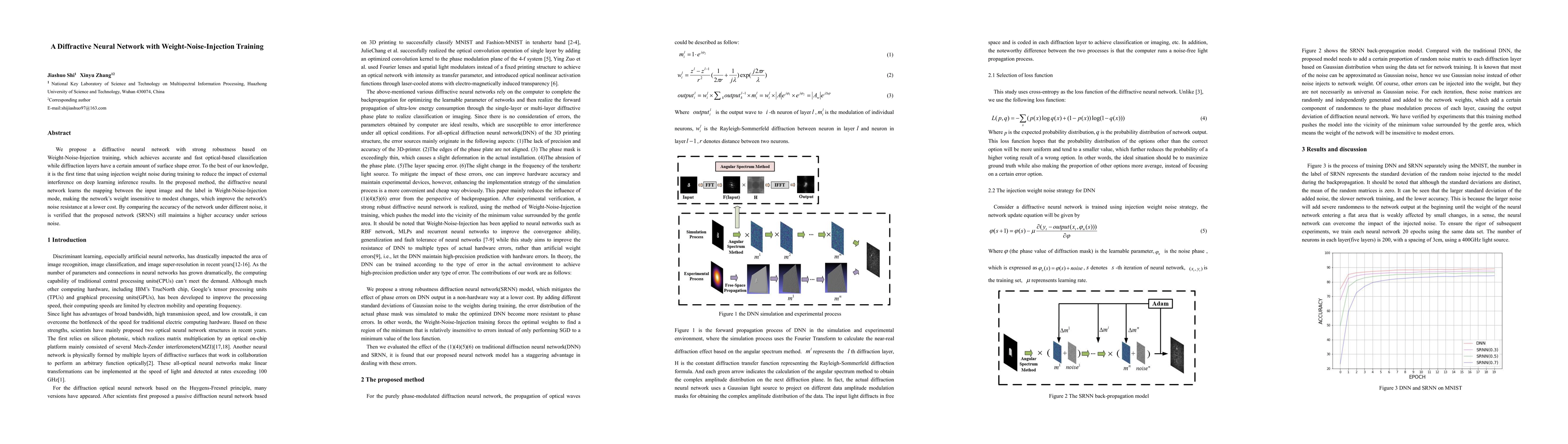 We propose a diffractive neural network with strong robustness based on Weight Noise Injection training, which achieves accurate and fast optical-based classification while diffraction layers have a certain amount of surface shape error. To the best of our knowledge, it is the first time that using injection weight noise during training to reduce the impact of external interference on deep learning inference results. In the proposed method, the diffractive neural network learns the mapping between the input image and the label in Weight Noise Injection mode, making the network's weight insensitive to modest changes, which improve the network's noise resistance at a lower cost. By comparing the accuracy of the network under different noise, it is verified that the proposed network (SRNN) still maintains a higher accuracy under serious noise.