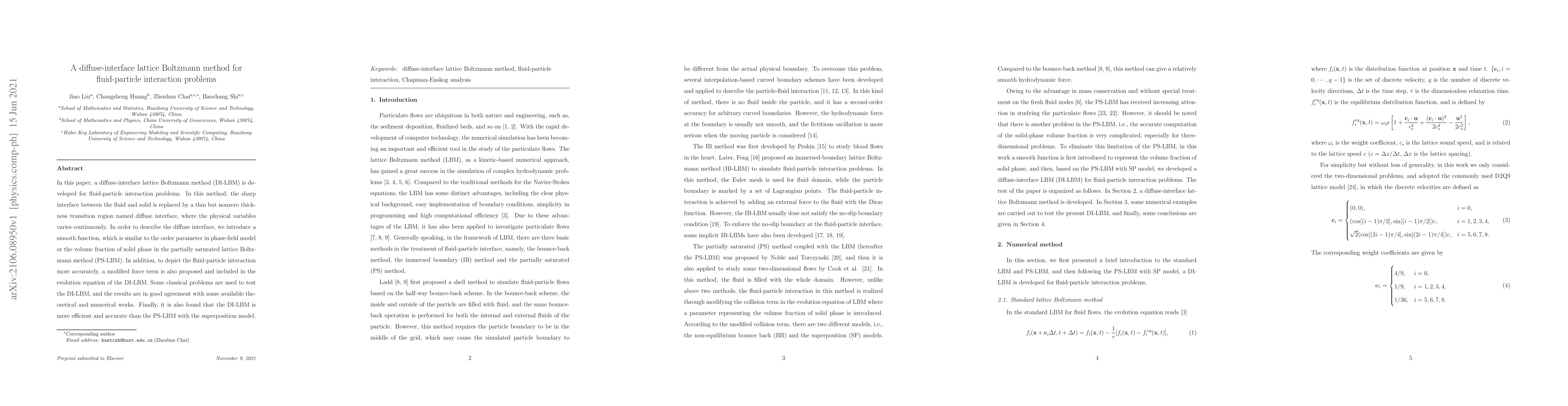 The paper introduces a diffuse-interface lattice Boltzmann method (DI-LBM) for simulating fluid-particle interaction problems, replacing sharp interfaces with a continuous transition region. The method incorporates a modified force term for improved accuracy and is shown to be more efficient than the partially saturated lattice Boltzmann method (PS-LBM).