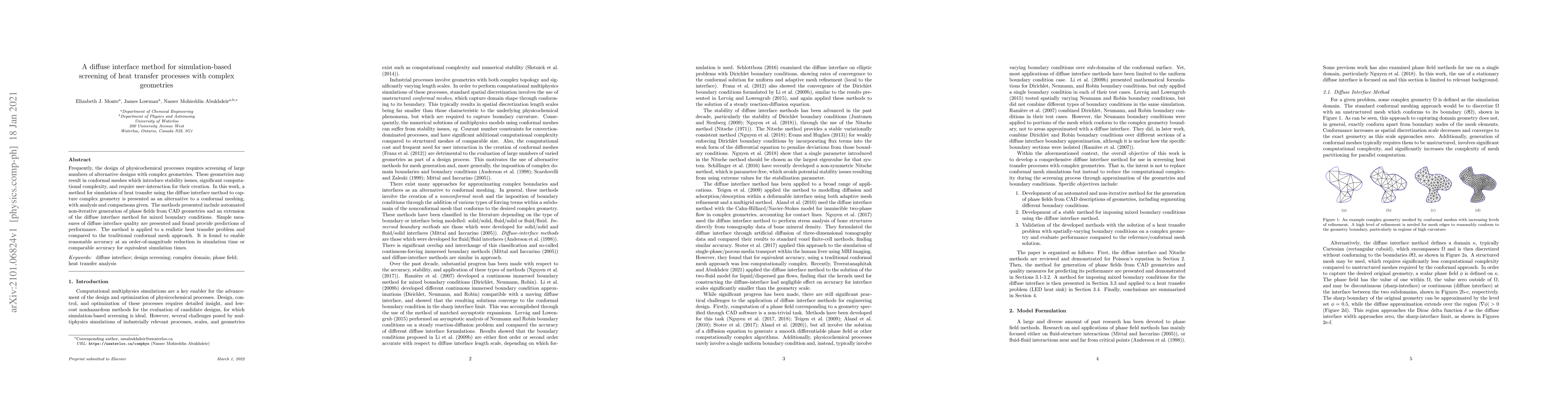 This paper introduces a diffuse interface method for simulating heat transfer processes with complex geometries, offering an alternative to conformal meshing. The method automates the generation of phase fields from CAD models and extends the diffuse interface approach for mixed boundary conditions, achieving significant reductions in simulation time while maintaining accuracy.