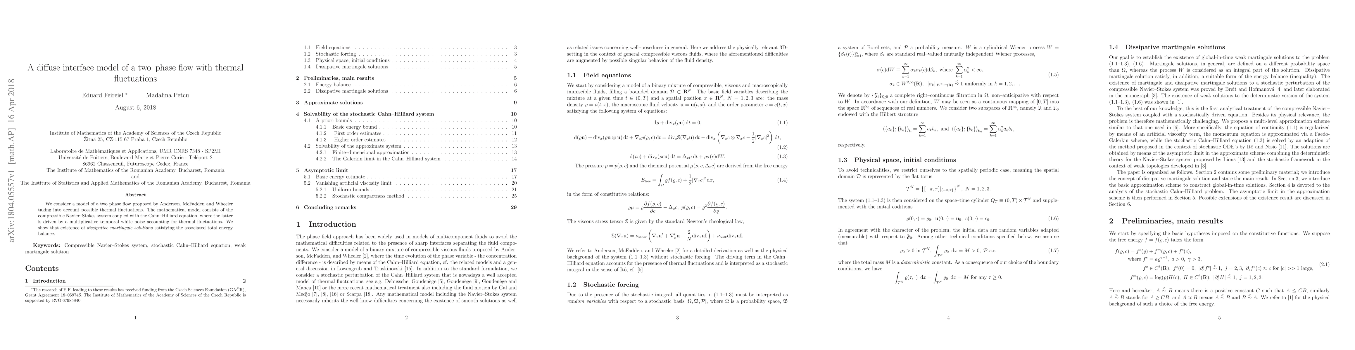 We consider a model of a two phase flow proposed by Anderson, McFadden and Wheeler taking into account possible thermal fluctuations. The mathematical model consists of the compressible Navier-Stokes system coupled with the Cahn-Hilliard equation, where the latter is driven by a multiplicative temporal white noise accounting for thermal fluctuations. We show that existence of dissipative martingale solutions satisfying the associated total energy balance.
