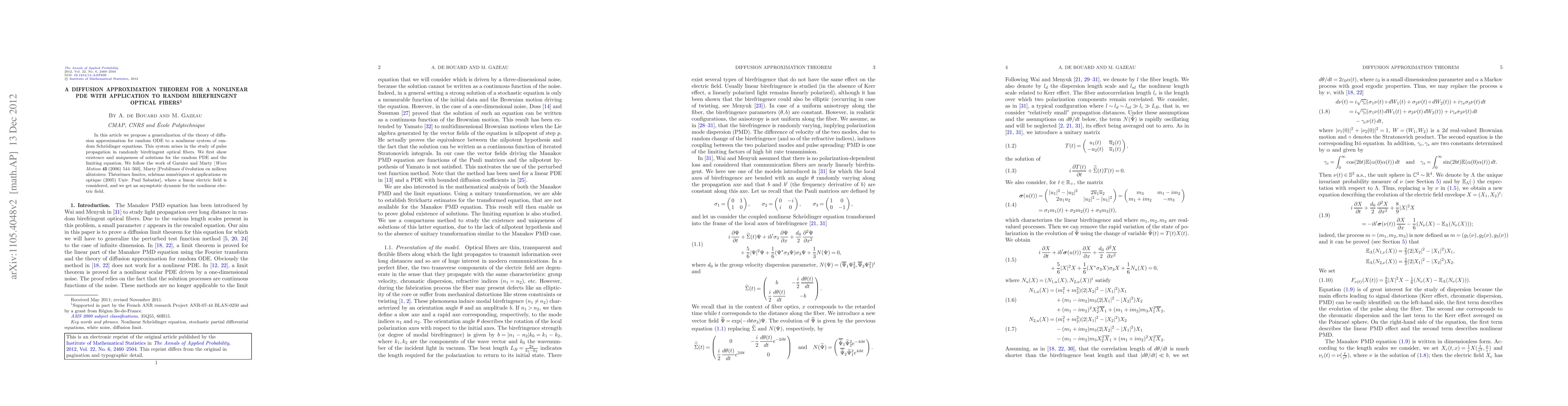 This paper generalizes diffusion approximation theory for random ordinary differential equations to a nonlinear system of random Schrödinger equations, which models pulse propagation in randomly birefringent optical fibers. It establishes the existence and uniqueness of solutions for both the random PDE and its limiting equation, providing an asymptotic dynamic for the nonlinear electric field.