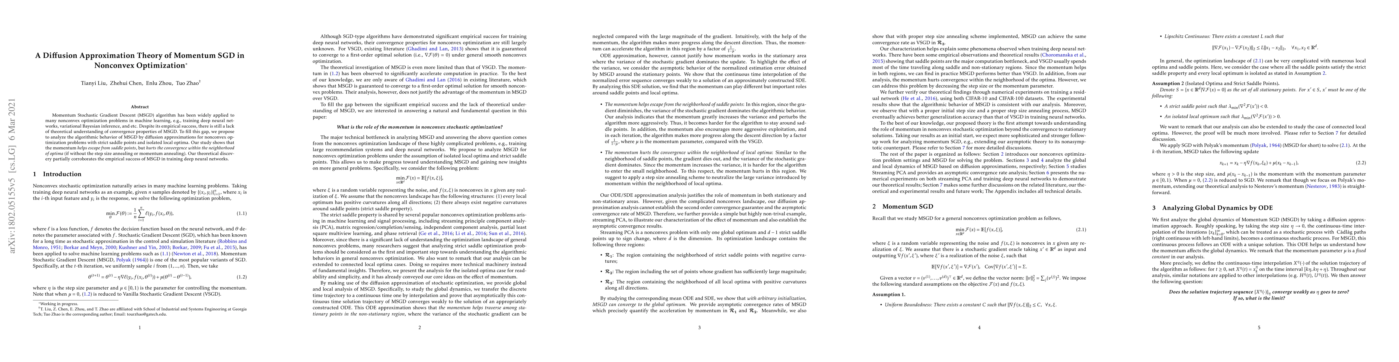 The paper analyzes Momentum Stochastic Gradient Descent (MSGD) algorithm's behavior in nonconvex optimization problems, finding that momentum helps escape saddle points but hurts convergence near optima.