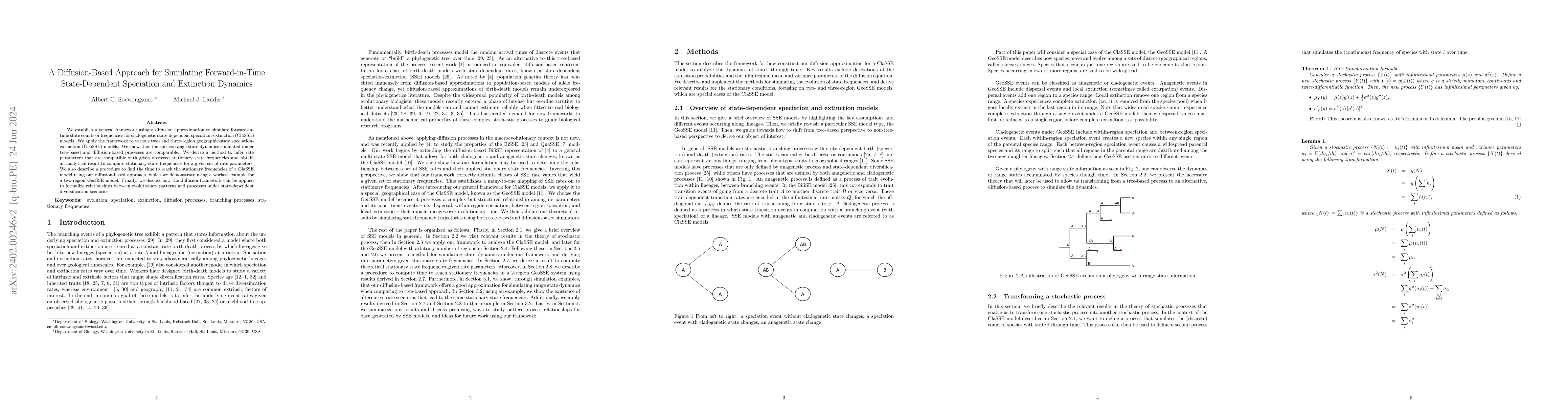This paper introduces a diffusion-based framework for simulating state-dependent speciation-extinction dynamics over time and compares its results with tree-based methods. The authors also develop techniques for inferring rate parameters and calculating stationary state frequencies for ClaSSE models, demonstrating their approach with a two-region GeoSSE model.