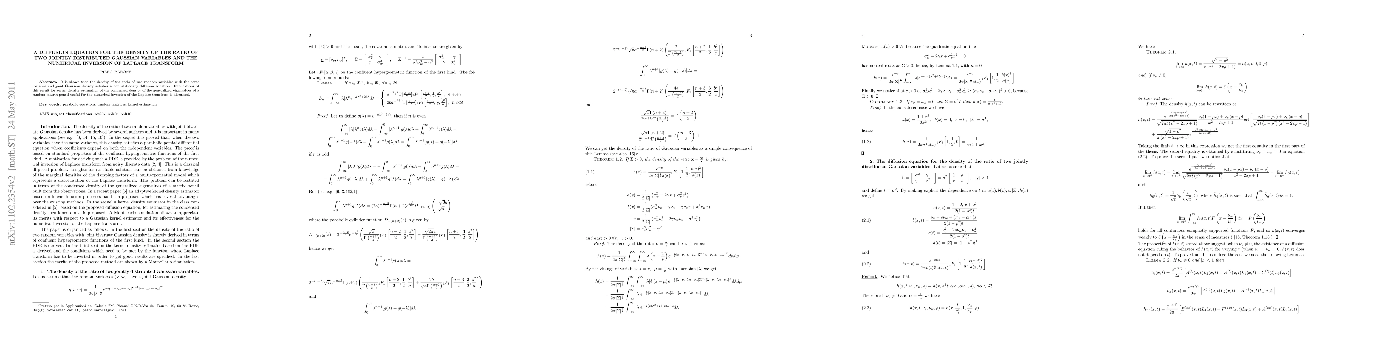 It is shown that the density of the ratio of two random variables with the same variance and joint Gaussian density satisfies a non stationary diffusion equation. Implications of this result for kernel density estimation of the condensed density of the generalized eigenvalues of a random matrix pencil useful for the numerical inversion of the Laplace transform is discussed.