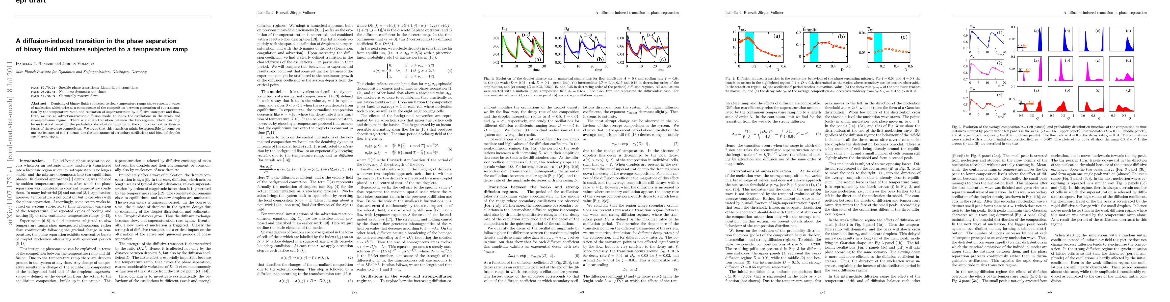 Demixing of binary fluids subjected to slow temperature ramps shows repeated waves of nucleation which arise as a consequence of the competition between generation of supersaturation by the temperature ramp and relaxation of supersaturation by diffusive transport and flow. Here, we use an advection-reaction-diffusion model to study the oscillations in the weak- and strong-diffusion regime. There is a sharp transition between the two regimes, which can only be understood based on the probability distribution function of the composition rather than in terms of the average composition. We argue that this transition might be responsible for some yet unclear features of experiments, like the appearance of secondary oscillations and bimodal droplet size distributions.