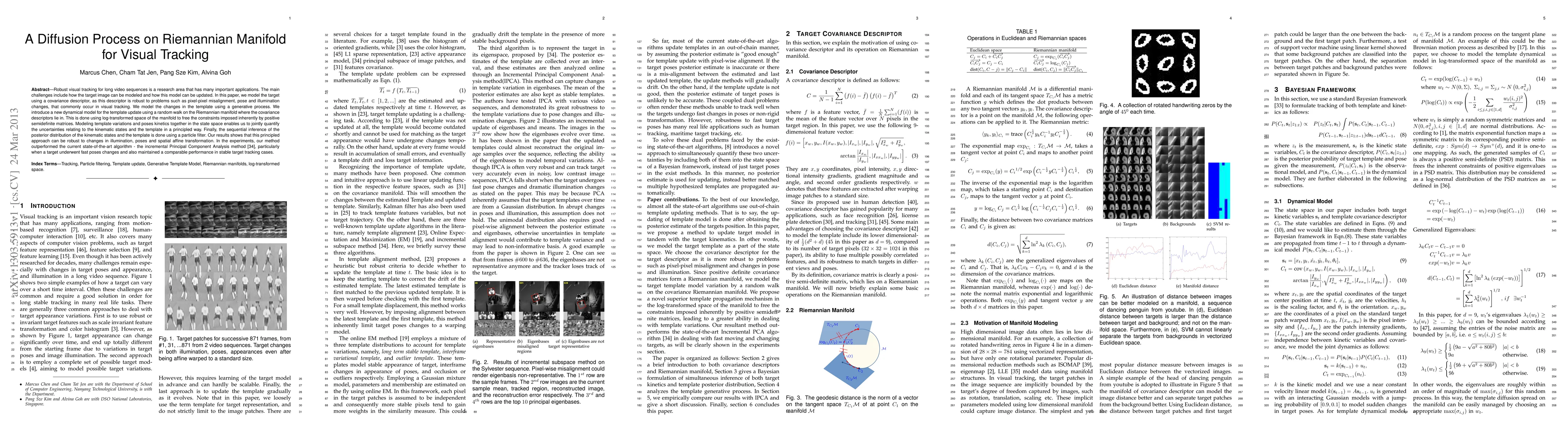Robust visual tracking for long video sequences is a research area that has many important applications. The main challenges include how the target image can be modeled and how this model can be updated. In this paper, we model the target using a covariance descriptor, as this descriptor is robust to problems such as pixel-pixel misalignment, pose and illumination changes, that commonly occur in visual tracking. We model the changes in the template using a generative process. We introduce a new dynamical model for the template update using a random walk on the Riemannian manifold where the covariance descriptors lie in. This is done using log-transformed space of the manifold to free the constraints imposed inherently by positive semidefinite matrices. Modeling template variations and poses kinetics together in the state space enables us to jointly quantify the uncertainties relating to the kinematic states and the template in a principled way. Finally, the sequential inference of the posterior distribution of the kinematic states and the template is done using a particle filter. Our results shows that this principled approach can be robust to changes in illumination, poses and spatial affine transformation. In the experiments, our method outperformed the current state-of-the-art algorithm - the incremental Principal Component Analysis method, particularly when a target underwent fast poses changes and also maintained a comparable performance in stable target tracking cases.