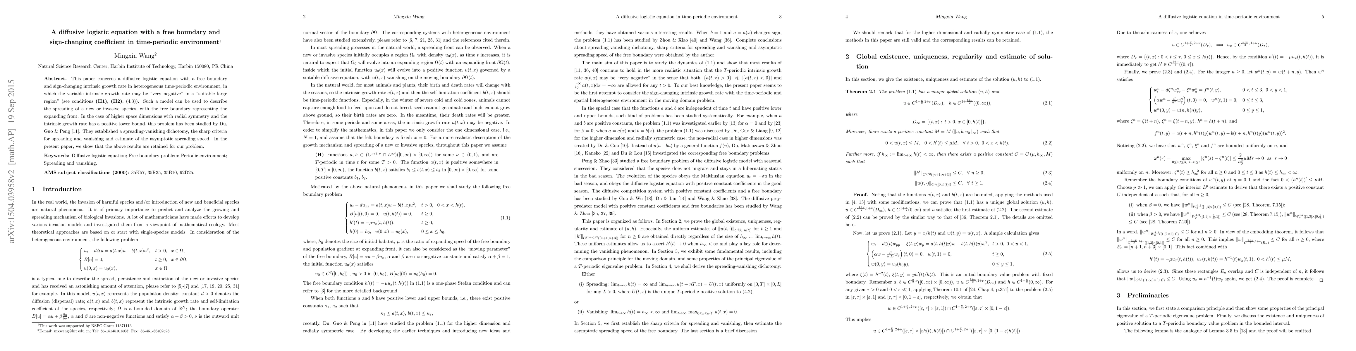 This paper concerns a diffusive logistic equation with a free boundary and sign-changing intrinsic growth rate in heterogeneous time-periodic environment, in which the variable intrinsic growth rate may be "very negative" in a "suitable large region". Such a model can be used to describe the spreading of a new or invasive species, with the free boundary representing the expanding front. In the case of higher space dimensions with radial symmetry and the intrinsic growth rate has a positive lower bound, this problem has been studied by Du, Guo and Peng . They established a spreading-vanishing dichotomy, the sharp criteria for spreading and vanishing and estimate of the asymptotic spreading speed. In the present paper, we show that the above results are retained for our problem. This paper has been submitted to Journal of Functional Analysis in August 5, 2014 (JFA-14-548).