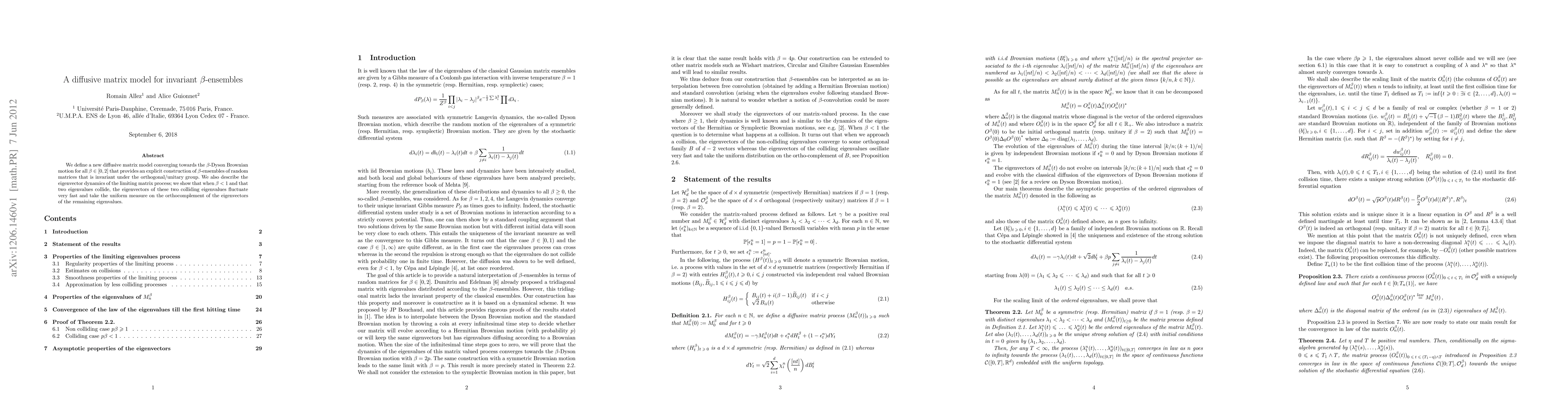 This paper introduces a novel diffusive matrix model that converges to $\beta$-Dyson Brownian motion for $\beta\in [0,2]$, offering an explicit construction of $\beta$-ensembles invariant under orthogonal/unitary groups. It also examines the eigenvector dynamics, revealing that when $\beta< 1$ and eigenvalues collide, the eigenvectors rapidly fluctuate uniformly in the orthocomplement of the remaining eigenvalues.