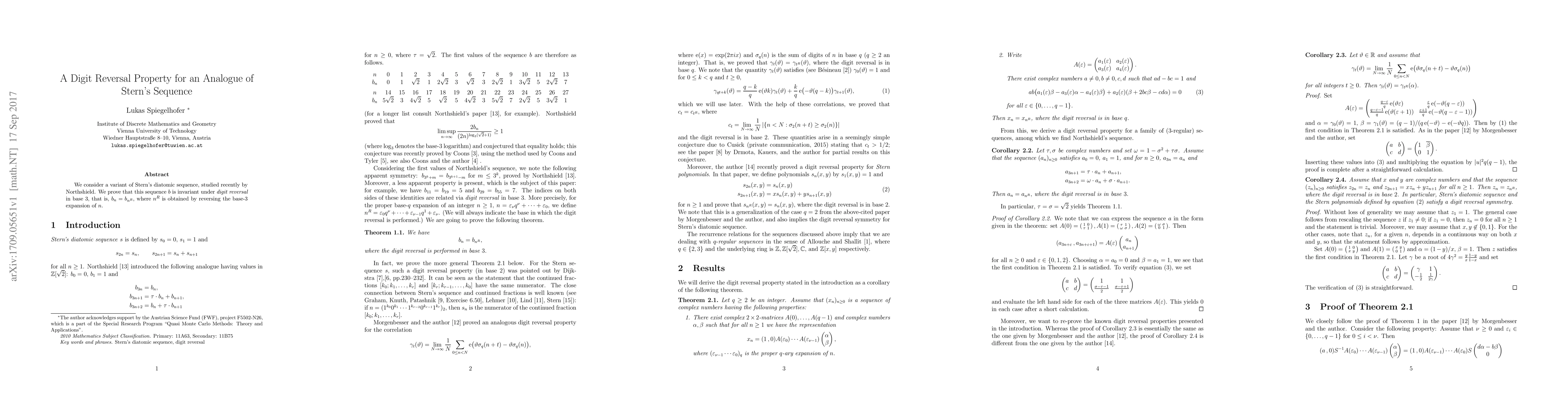 We consider a variant of Stern's diatomic sequence, studied recently by Northshield. We prove that this sequence $b$ is invariant under \emph{digit reversal} in base $3$, that is, $b_n=b_{n^R}$, where $n^R$ is obtained by reversing the base-$3$ expansion of $n$.