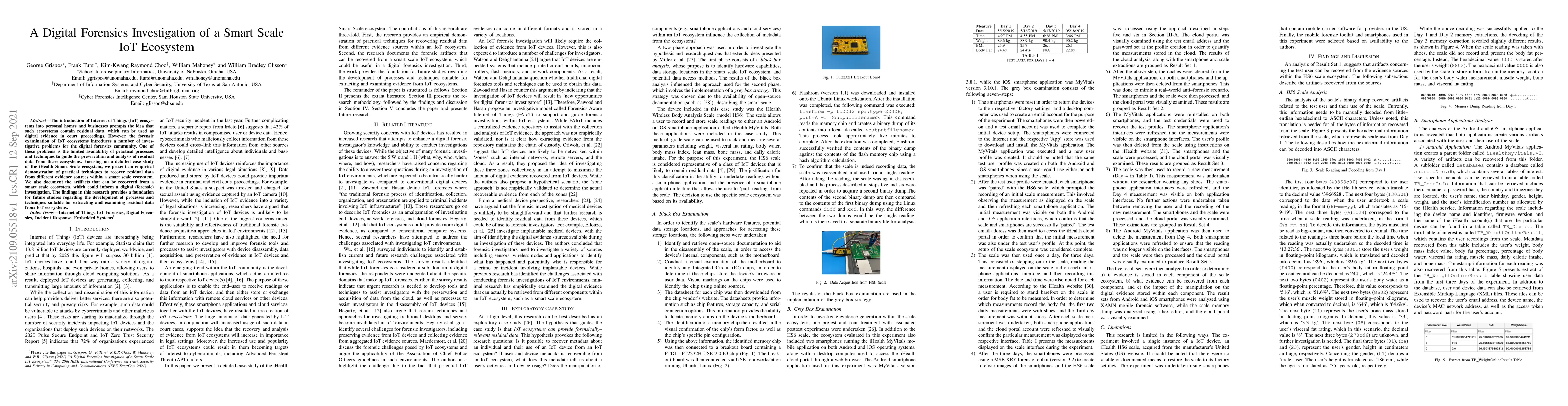 This paper investigates the digital forensics challenges of IoT ecosystems, specifically focusing on the iHealth Smart Scale. It demonstrates practical techniques for recovering residual data and identifies recoverable artifacts, laying a foundation for future research in IoT digital forensics.