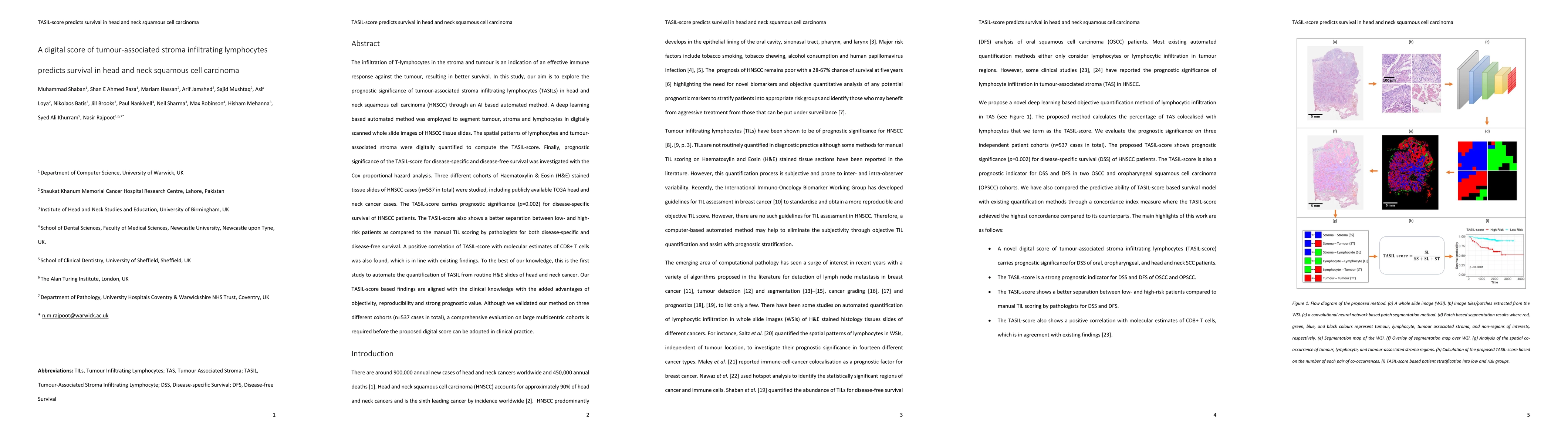 This study uses an AI-based deep learning method to quantify tumour-associated stroma infiltrating lymphocytes (TASILs) in head and neck squamous cell carcinoma (HNSCC) tissue slides, finding that the TASIL-score predicts better survival outcomes and outperforms manual scoring by pathologists.