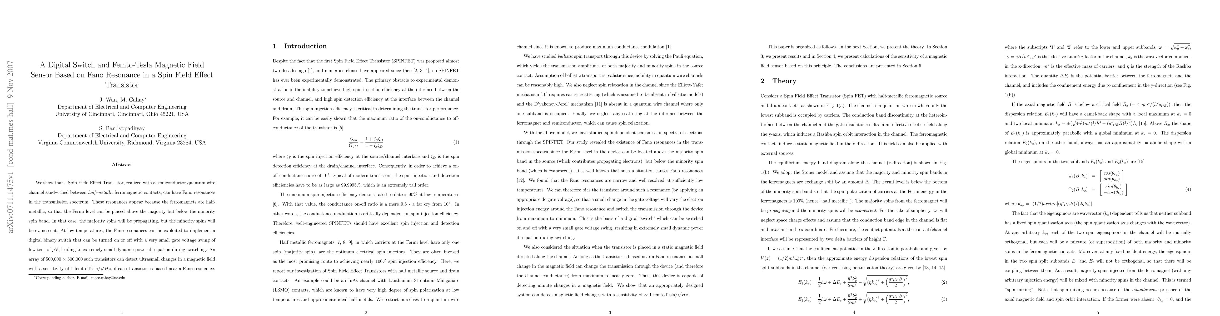 This paper demonstrates a Spin Field Effect Transistor utilizing Fano resonances for a digital switch and a femto-Tesla magnetic field sensor. The device, based on a semiconductor quantum wire with half-metallic ferromagnetic contacts, can detect ultrasmall magnetic field changes with high sensitivity.