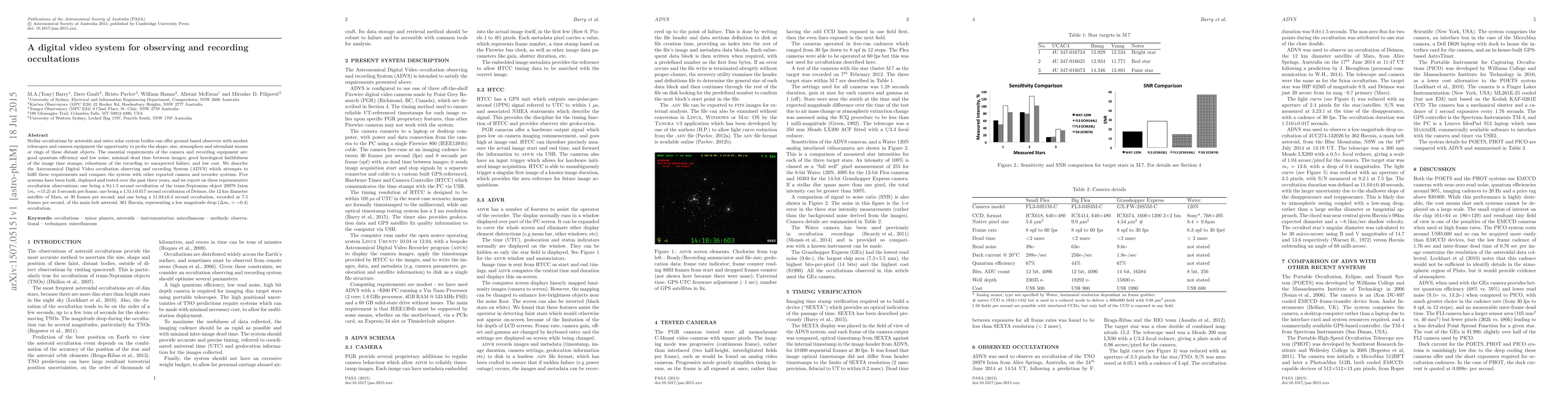 The paper describes the Astronomical Digital Video occultation observing and recording System (ADVS) designed to meet the requirements for observing stellar occultations by asteroids and outer solar system bodies, including good quantum efficiency, low noise, and robustness. The system was tested over three years, with successful observations of occultations by 28978 Ixion, Deimos, and 361 Havnia.