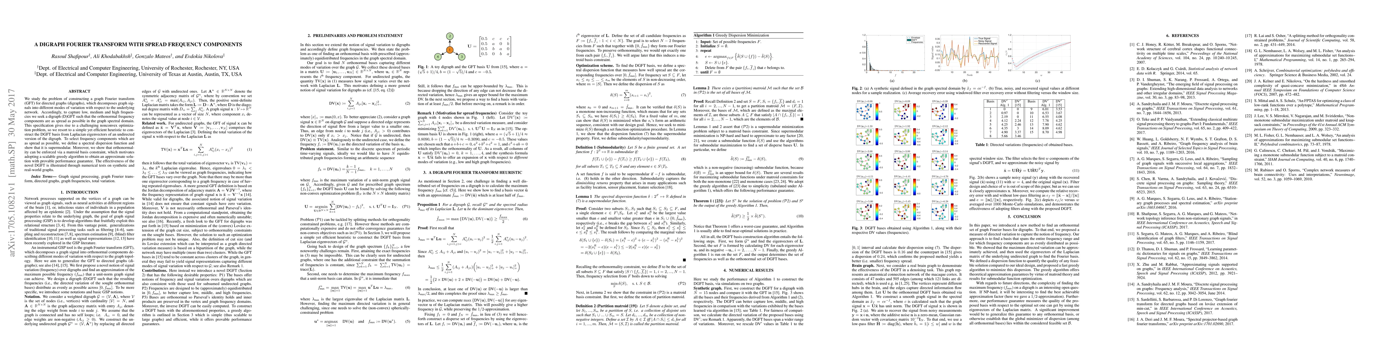 We study the problem of constructing a graph Fourier transform (GFT) for directed graphs (digraphs), which decomposes graph signals into different modes of variation with respect to the underlying network. Accordingly, to capture low, medium and high frequencies we seek a digraph (D)GFT such that the orthonormal frequency components are as spread as possible in the graph spectral domain. This specification gives rise to a challenging nonconvex optimization problem, so we resort to a simple yet efficient heuristic to construct the DGFT basis from Laplacian eigenvectors of an undirected version of the digraph. To select frequency components which are as spread as possible, we define a spectral dispersion function and show that it is supermodular. Moreover, we show that orthonormality can be enforced via a matroid basis constraint, which motivates adopting a scalable greedy algorithm to obtain an approximate solution with provable performance guarantee. The effectiveness of the novel DGFT is illustrated through numerical tests on synthetic and real-world graphs.
