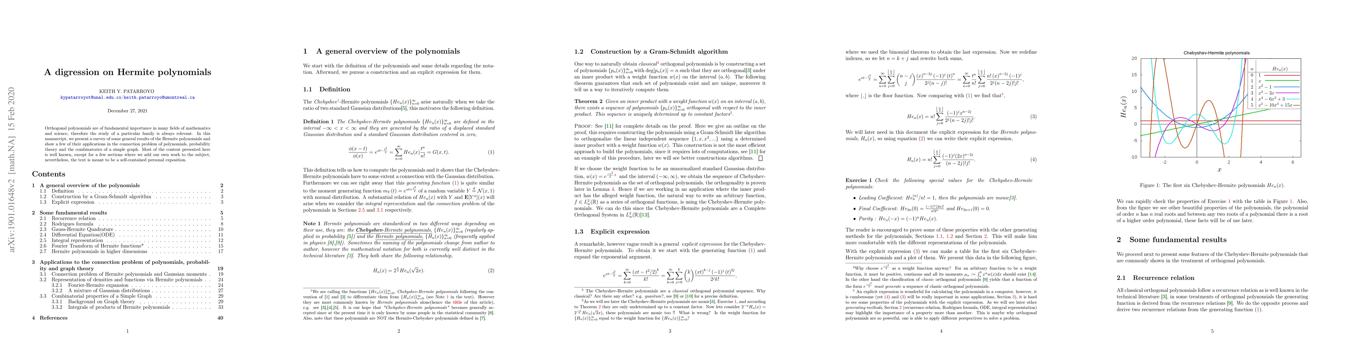 Orthogonal polynomials are of fundamental importance in many fields of mathematics and science, therefore the study of a particular family is always relevant. In this manuscript, we present a survey of some general results of the Hermite polynomials and show a few of their applications in the connection problem of polynomials, probability theory and the combinatorics of a simple graph. Most of the content presented here is well known, except for a few sections where we add our own work to the subject, nevertheless, the text is meant to be a self-contained personal exposition.