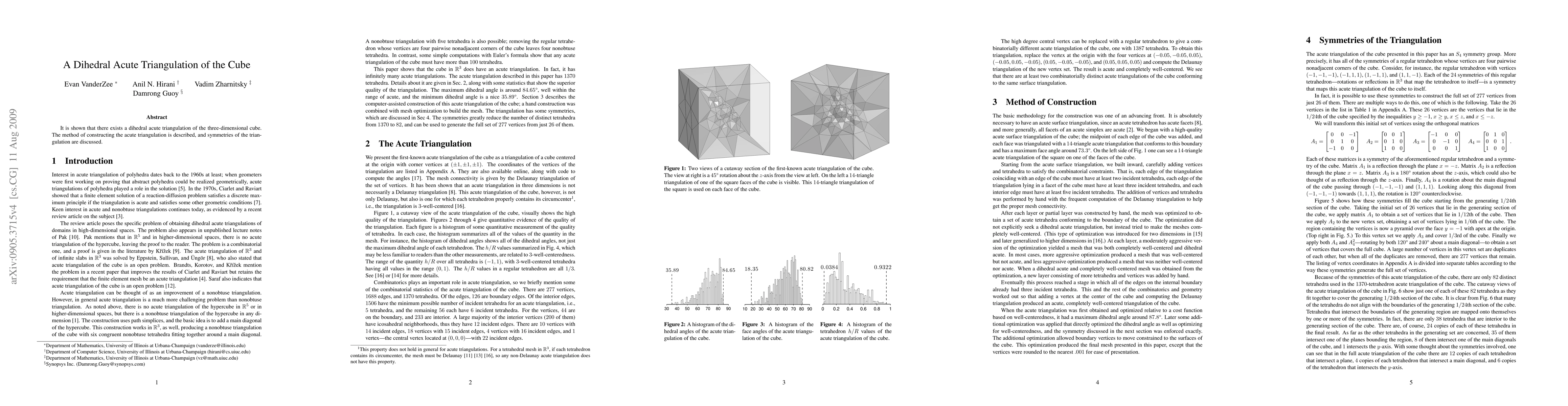Summary: The paper presents a dihedral acute triangulation of the cube, illustrating its construction method and exploring the symmetries inherent in the resulting structure. This triangulation maintains acute angles, offering insights into three-dimensional geometry.