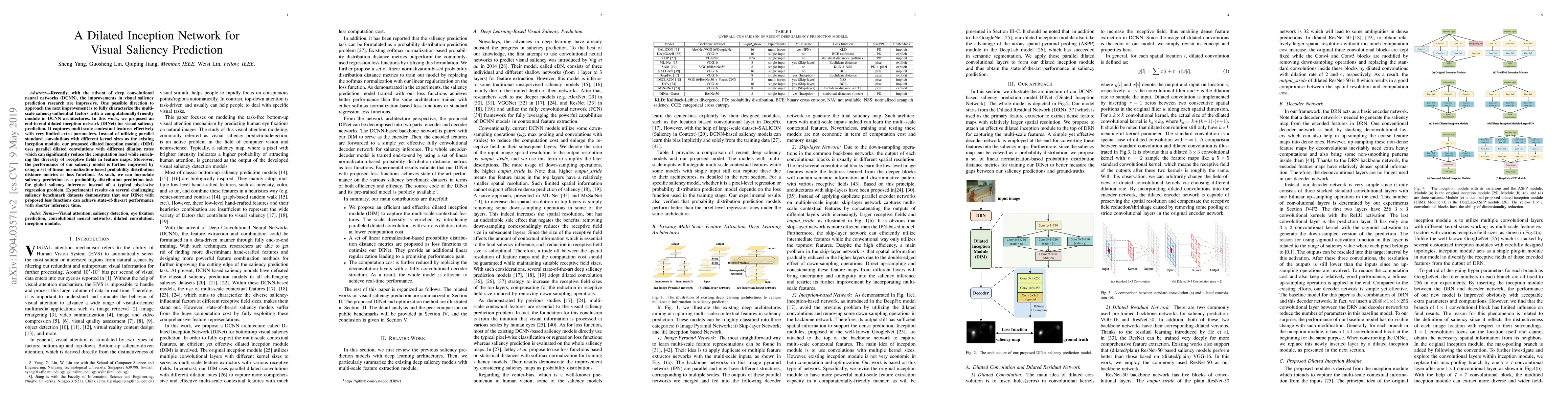 This paper proposes a dilated inception network (DINet) for visual saliency prediction, utilizing dilated convolutions to capture multi-scale features efficiently. The model achieves state-of-the-art performance with reduced computational load and improved inference time, using probability distribution distance metrics as loss functions.